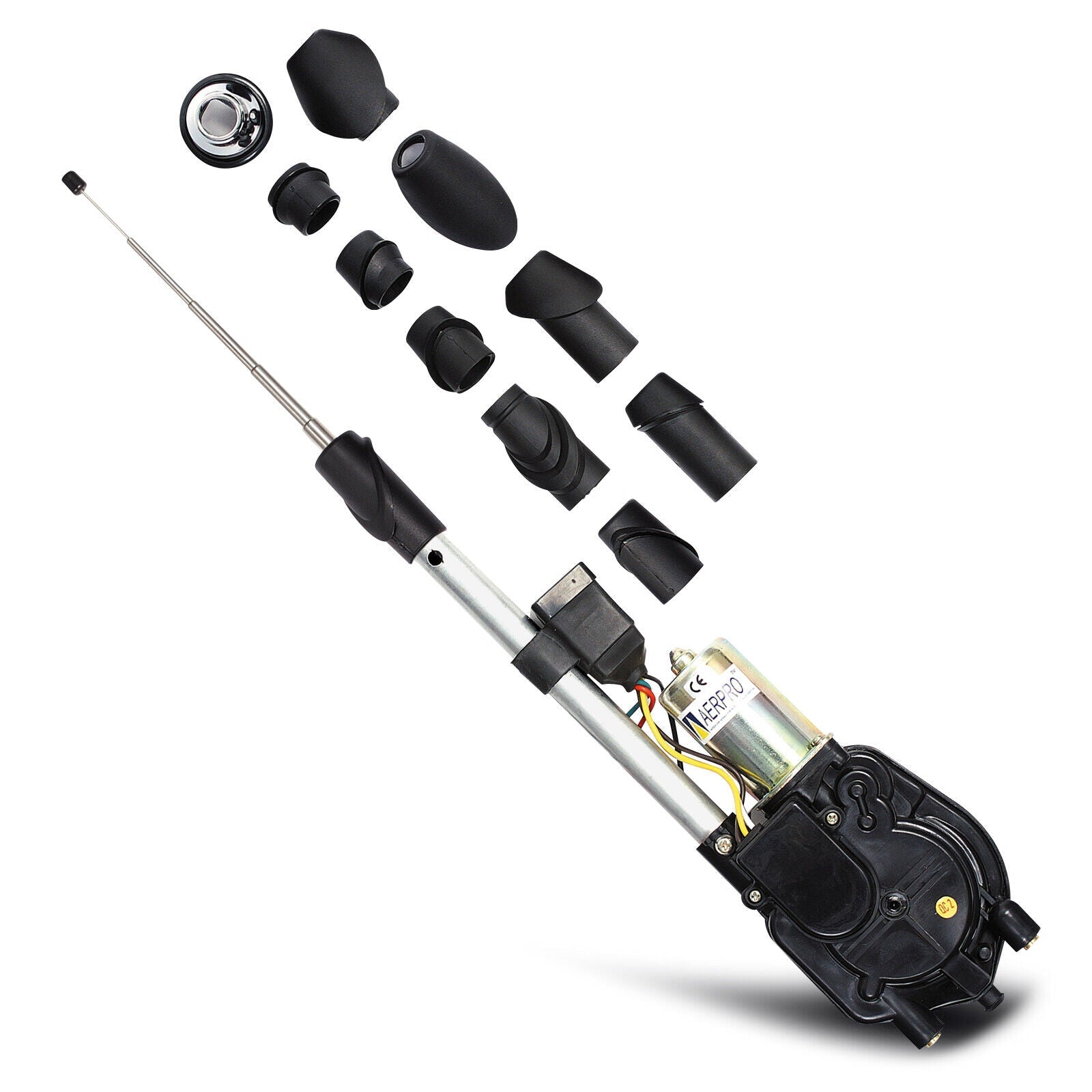 The Aerpro AP178E is a universal electric antenna that features a 5-section stainless steel mast that extends to 84cm. It includes 11 different mounting heads making it suitable for most vehicles with a 0-68 degree guard angle. Before installing, check under the guard to ensure there is at least 300mm space for mounting the electric motor assembly at the base of the antenna. As this is a universal type of product, installation may require additional parts.