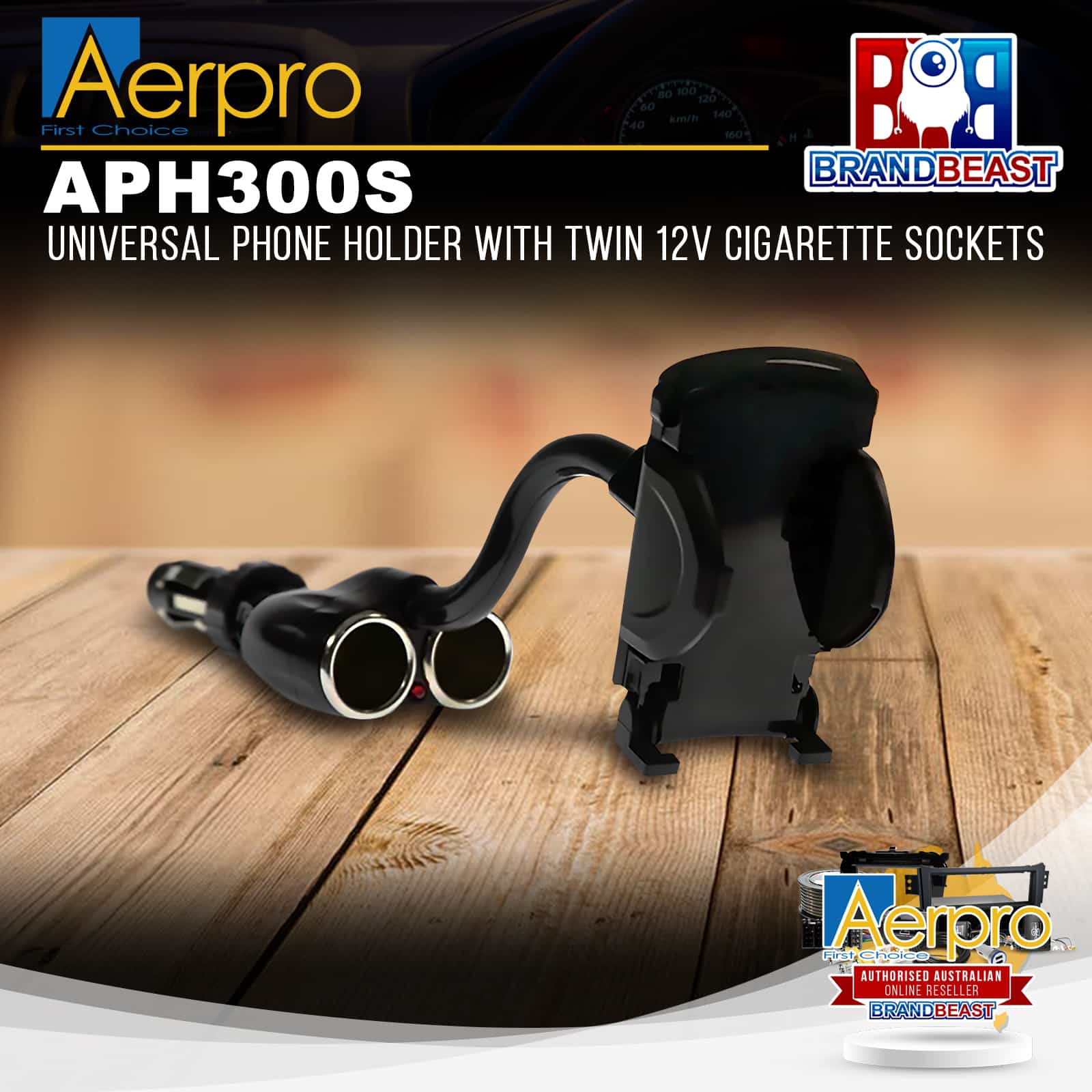 The Aerpro APH300S is a universal device/phone holder, whilst also providing 2 x 12V cigarette sockets for dual charging. Adjustable to hold all types of mobile phones, Smartphones, PDA, GPS & MP3/MP4 devices. Flexible goose neck stalk allows easy positioning to suit your viewing angle.