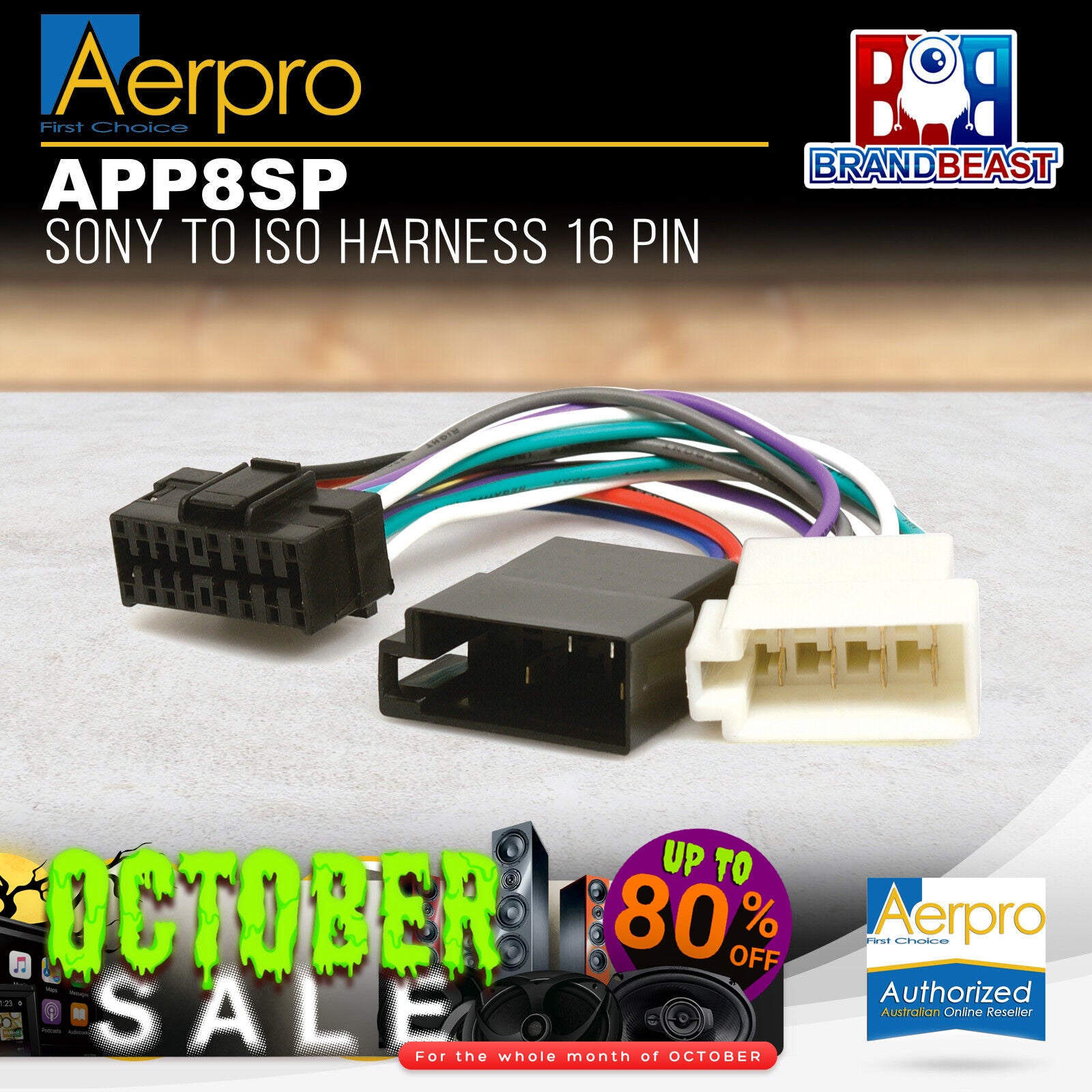 Suitable for various Sony Aftermarket Headunits with 16 pin connectors, APP8SP is a Secondary ISO Harness that converts the aftermarket headunit plug into a universal double ISO connector system. For a simple plug and play installation of your aftermarket headunit into your vehicle, pair this harness with an Aerpro Vehicle Specific Harness; APP Series Primary ISO Harness, Steering Wheel Control Interface or Infodapter and the two looms will connect together via the ISO connector system