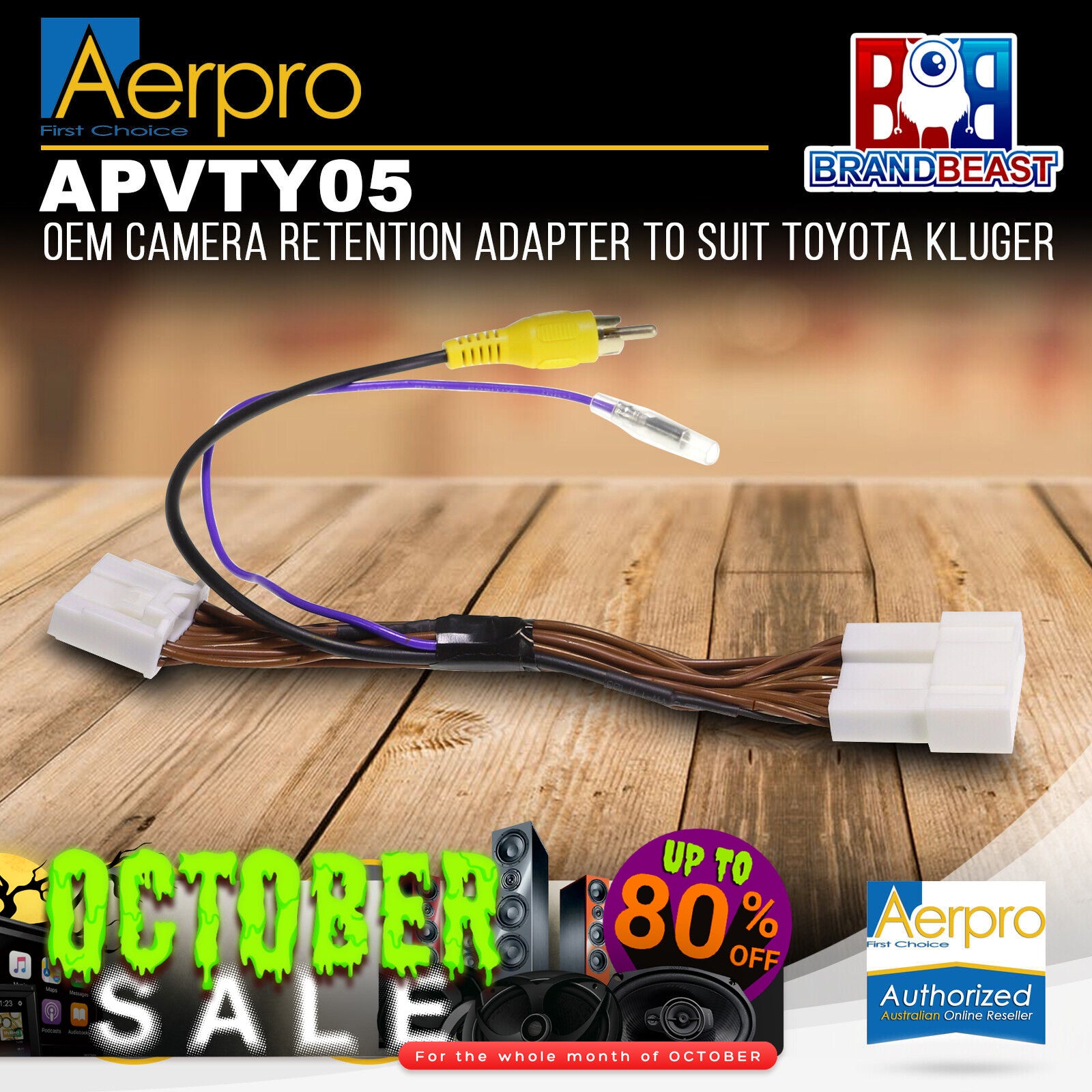 OEM Camera Retention AdapterSuitable for use with Toyota Kluger (2007 - 2013) with the reverse image on a small screen above the factory headunit. APVTY05 Aerpro camera adapter harness allows the factory reverse camera image to display on compatible aftermarket headunits. The adapter harness is easy to install, it features a vehicle-specific plug and socket that connects inline with the factory display and provides an RCA plug and trigger wire which connect to the aftermarket headunit. APVTY05 also includes a female RCA socket that allows an aftermarket camera to connect to the OEM screen in the vehicle, allowing a secondary camera to be added if required (e.g. Top-down or trailer camera).