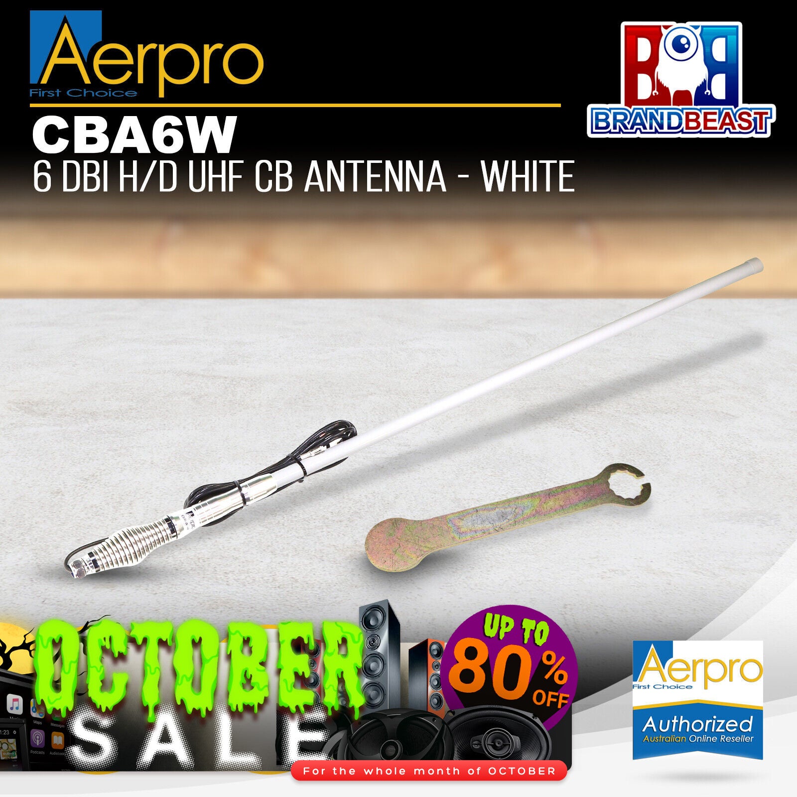 6dBi 477MHz Heavy-Duty White Radome UHF AntennaThe Aerpro CBA6W 6dBi 477MHz Heavy Duty White Radome UHF Antenna is compatible with all brands of 477MHz UHF CB Radios in Australia and New Zealand. With 6dBi gain, this medium gain antenna is a great all round performing antenna. The elliptical radiation pattern is more rounded compared to a high gain antenna and radiates further compared to a low gain antenna, making it ideal for medium range communication in various environments such as suburban landscapes, towns and low density woodlands.