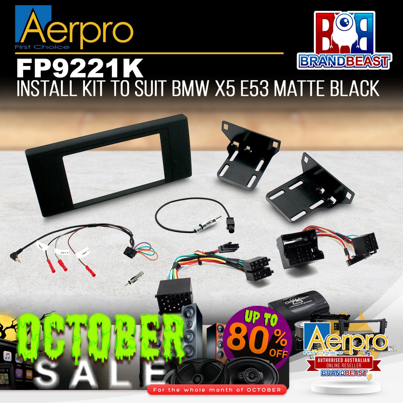 The Aerpro FP9221K install kit contains all the components required to install a 2-DIN aftermarket headunit into an BMW X5 whilst retaining full use of the factory steering wheel controls.