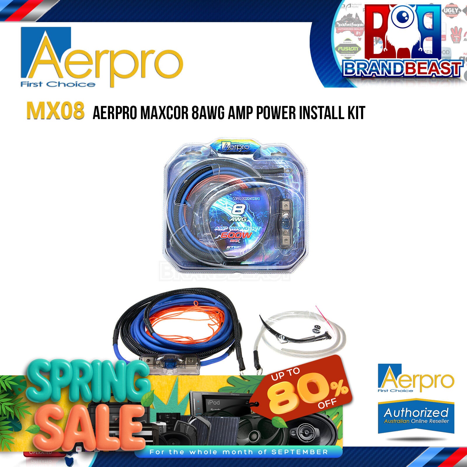 MAXCOR 8AWG Amplifier Power Kit Aerpro Maxcor: Represents the perfect balance between power and performance. The MX08 Amp Power Install Kit delivers up to 600W of power and meets AWG Standards. Ideally used to power 2 2-channel amp up to 600w in total. The MAXCOR soft touch super flex (STSF) cables allow easier installation without compromising power. The kit includes a 6-metre 8AWG power cable, 0.8-metre 8AWG Earth cable, 5-metre 20AWG trigger cable, 60A ANL fuse and fuse holder, cable ties, and all required professional fitting terminals.