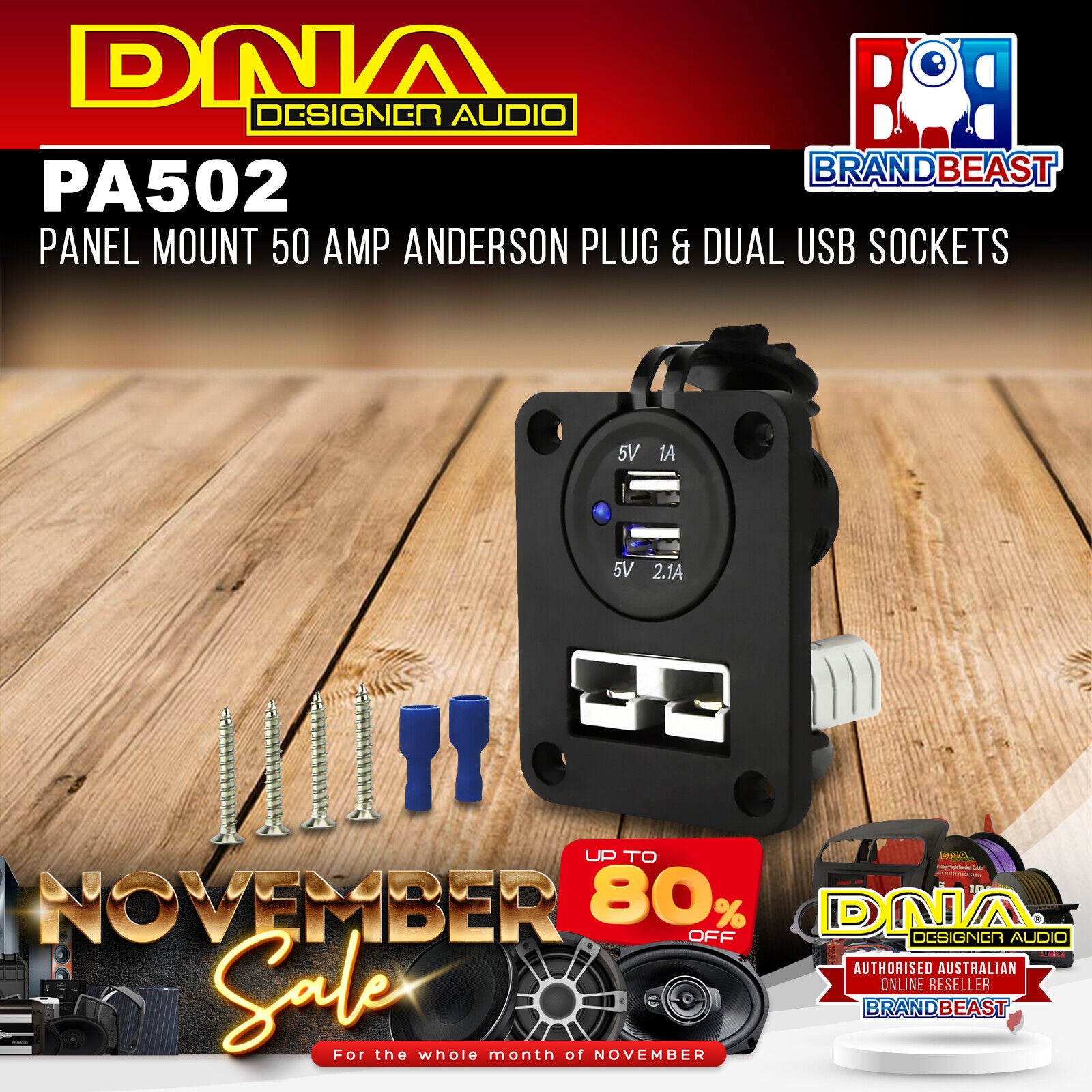 Standard grey 50 Amp Anderson plug and a 12~24 volt cigarette accessory socket in a flush mount housing. Designed with a marine grade housing with fitted with a waterproof dust cap over the accessory socket.