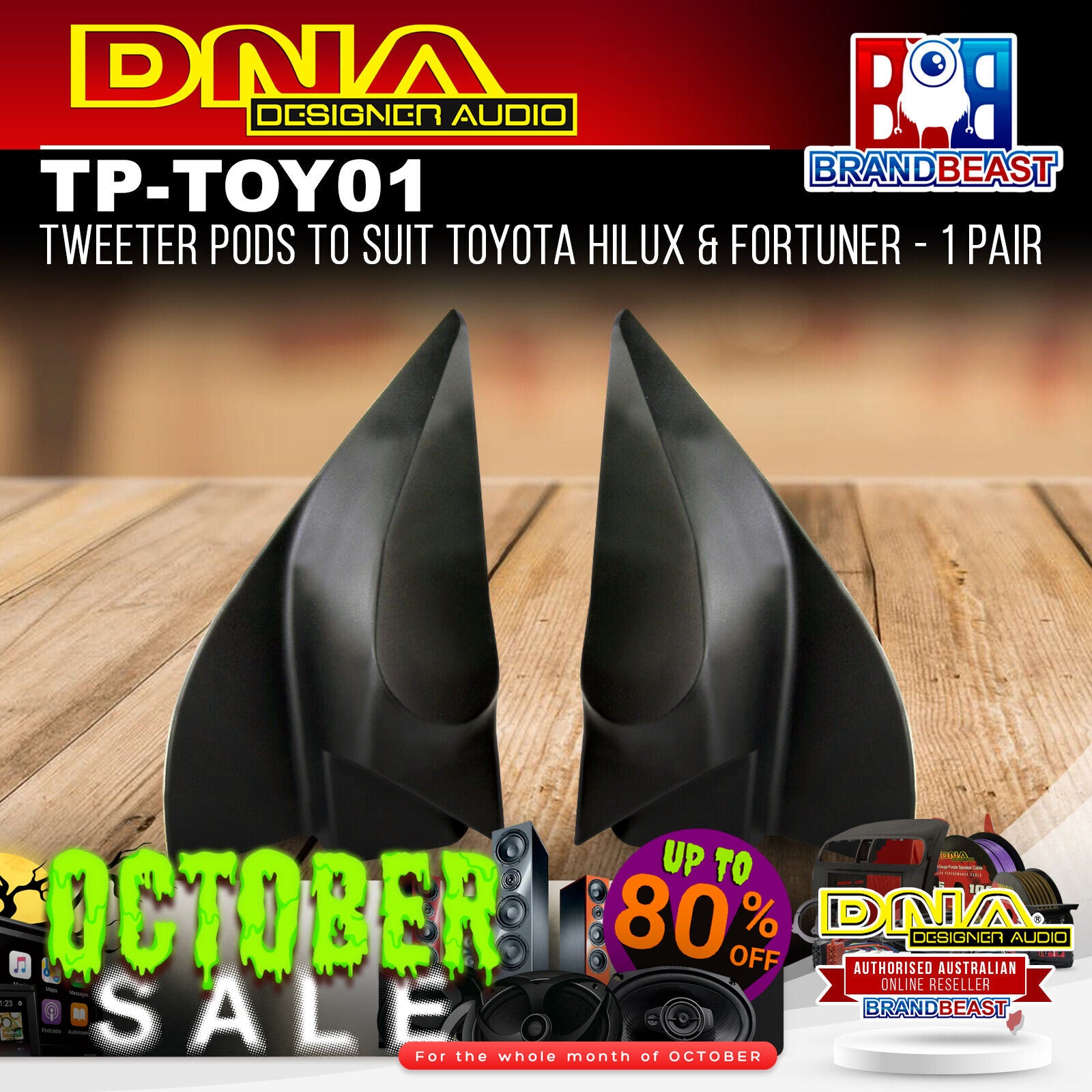 Tweeter Pods Suit Toyota - 1 Pair The DNA TP-TOY01 molded tweeter pods are designed to allow up to 50mm diameter tweeters to be installed with a sleek factory look. Made from factory textured ABS plastic they replace your original front door sails by retaining the use of the factory clips and mounting holes. Depending on the tweeters installed, some custom steps may be required to mount them correctly.