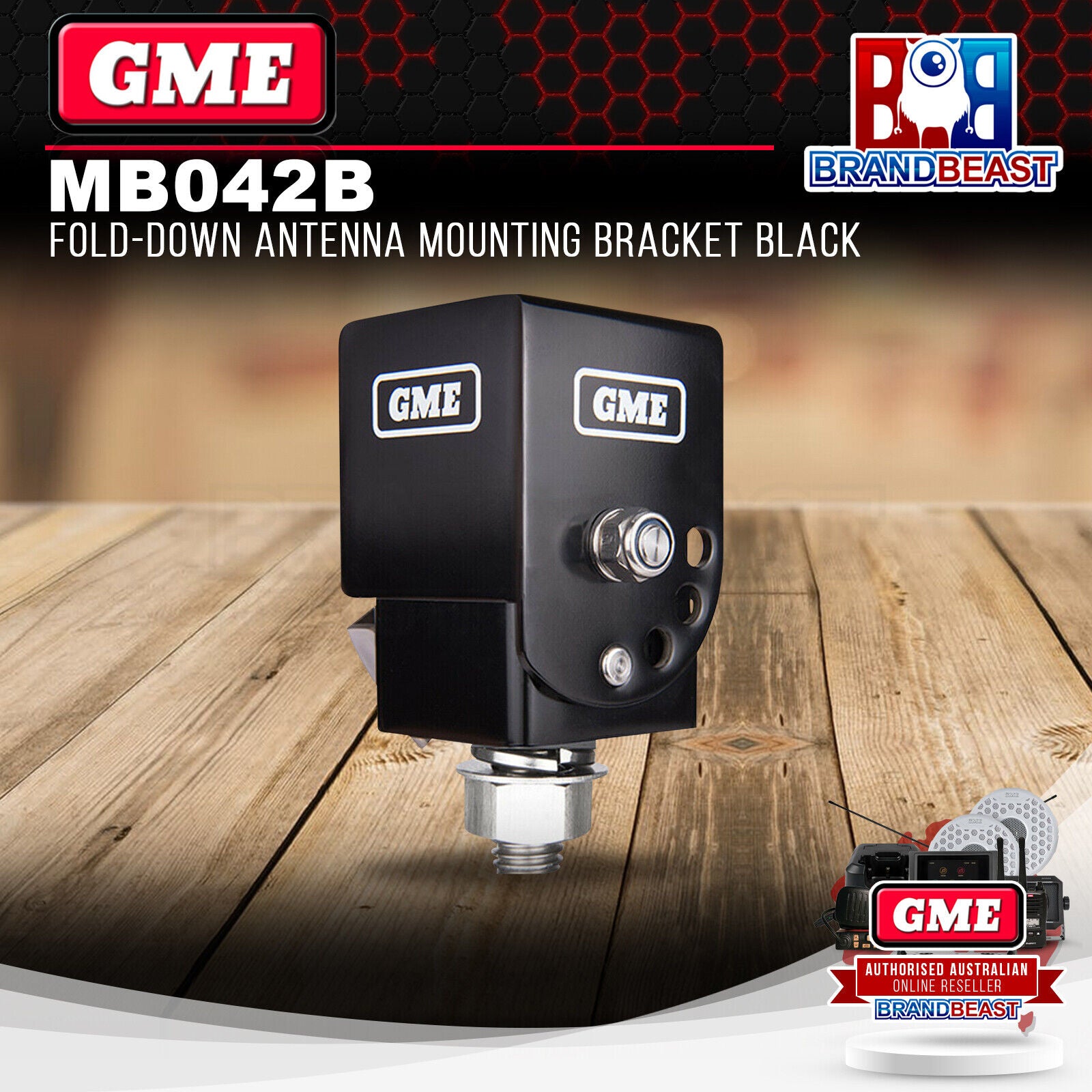 The MB042B Fold-down antenna mounting bracket from GME is a rugged, durable, stainless steel antenna mount, designed to offer a quick and convenient method of lowering the antenna on your vehicle without specialised tools or the requirement to remove the whip from the antenna base. The fold-down antenna mounting bracket is perfect for raised 4WD vehicles requiring entry to low-height car parks or garages, with 4 levels of adjustment through a simple lever and pin arrangement.
