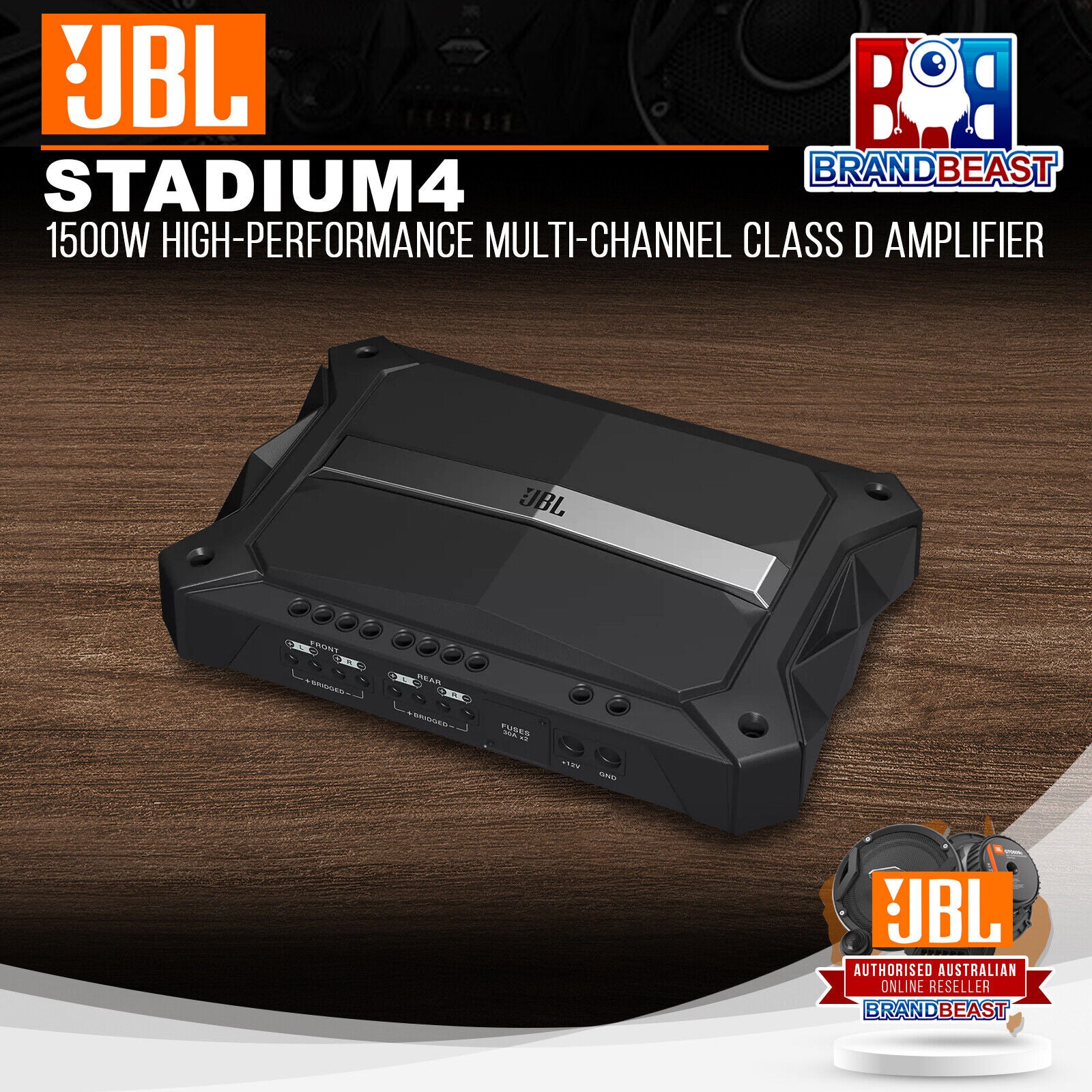 All JBL Stadium amplifiers come equipped with newly introduced E.A.R.L terminal for better grounding. For 5-channel and mono amplifiers, adapter connector is available in the box for easy installation.