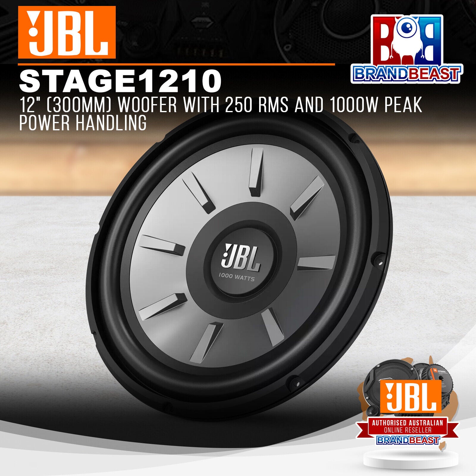 12" Stage Series Component Subwoofer - JBL Stage 1210 Price leading JBL Stage car subwoofers were engineered to deliver high-output, low-distortion bass with power handling capability of up to 1000 watts peak power. (Available in three sizes—8" (200mm), 10" (250mm), 12" (300mm)—for every size vehicle from compact to limo.)