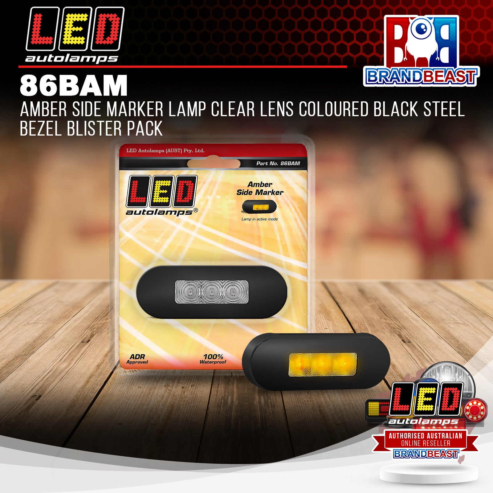 LED Autolamps 86BAM Amber Side Marker Lamp Clear Lens Coloured Black Steel Bezel Blister Pack