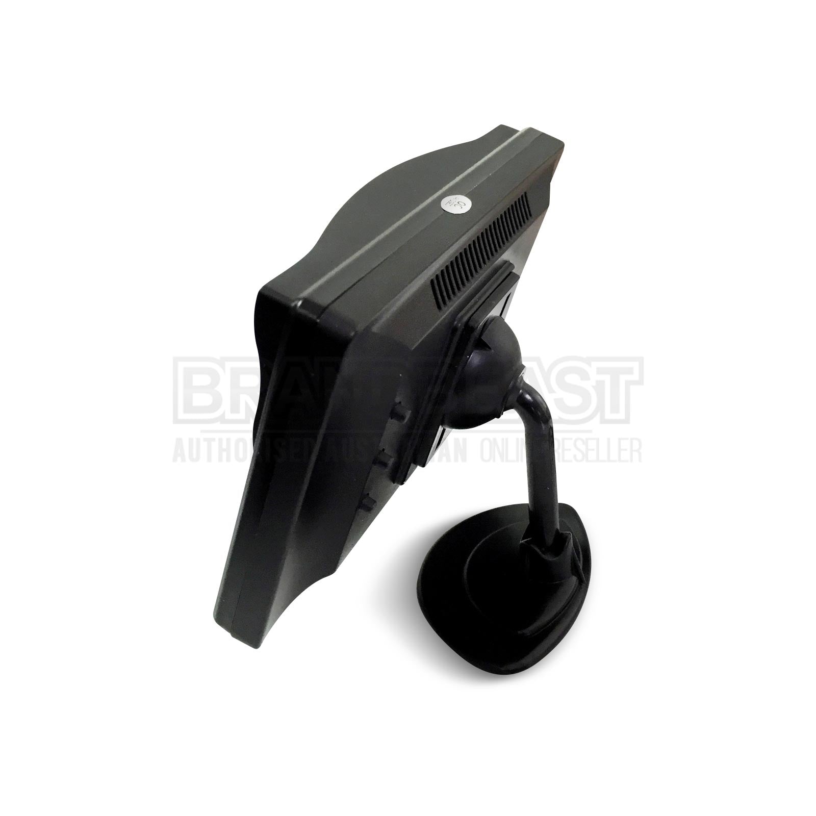 The monitor includes both permanent dashboard mounting via self-adhesive bracket and temporary windscreen mounting through the supplied suction cup ball and socket system. Built-in sun visor hood ensures clear visibility even in bright Australian sunlight, while manual brightness, contrast, and colour controls allow optimisation for any lighting condition.