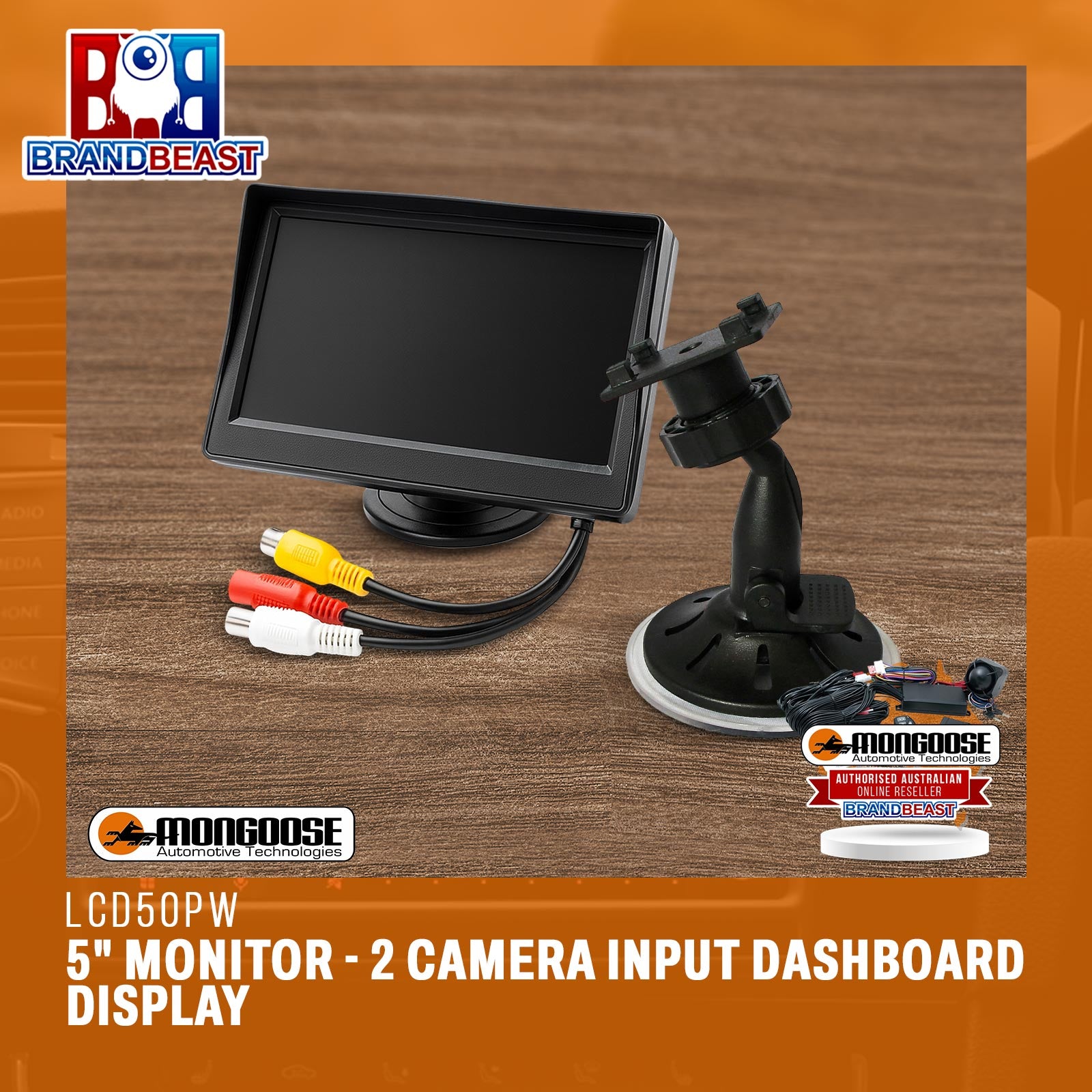 The Mongoose LCD50PW 5" Colour Monitor provides professional-grade visual monitoring for dual camera setups with intelligent automatic switching capabilities. This versatile 12V LCD display handles two camera inputs with seamless auto-switching when reverse gear is engaged, making it perfect for comprehensive vehicle monitoring systems combining reversing cameras with front, side, or trailer cameras.