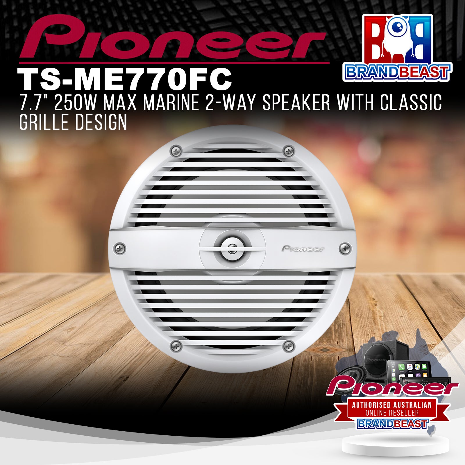 Pioneer ME-series speakers (both Sports and Classic designs) are protected from the effects of sun and water exposure, meeting both IPX7 and ASTM D4329 certification to achieve all-weather reliability. Mica Reinforced IMPP monocoque cone with butyl rubber surround, constructed using an advanced in-mold bonding technique for superior water resistance while maintaining high quality, powerful sound. The symmetrical motor design with high-strength suspension is optimized to provide stability, linearity, and clear, low-distortion sound reproduction. Lightweight polyimide (PI) tweeter diaphragm and uniquely shaped waveguide provide natural and clear vocals with wide dispersion. The TS-ME770FC 7.7″ Speakers come with sleek classic style grilles in a white finish that cosmetically integrates seamlessly into marine interiors and cabin designs.