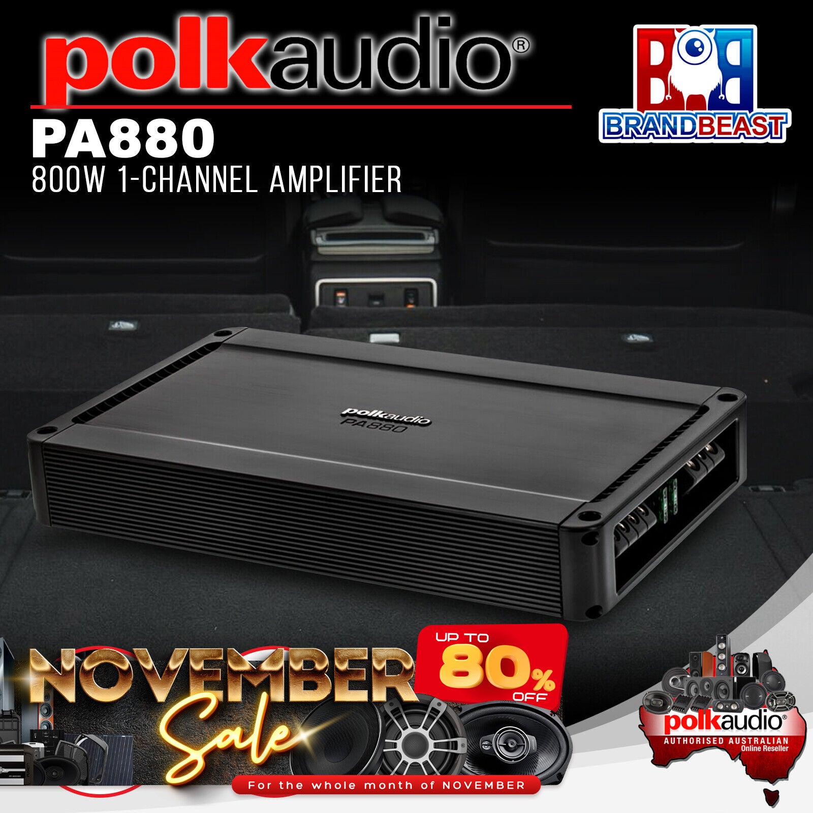The PA880 is a single-channel class A/B amplifier with built-in fully variable low-pass crossover. The PA880 monoblock is equipped with optional remote bass EQ control and is capable of one-channel operation with a maximum power of 800 Watts into 2 ohms.