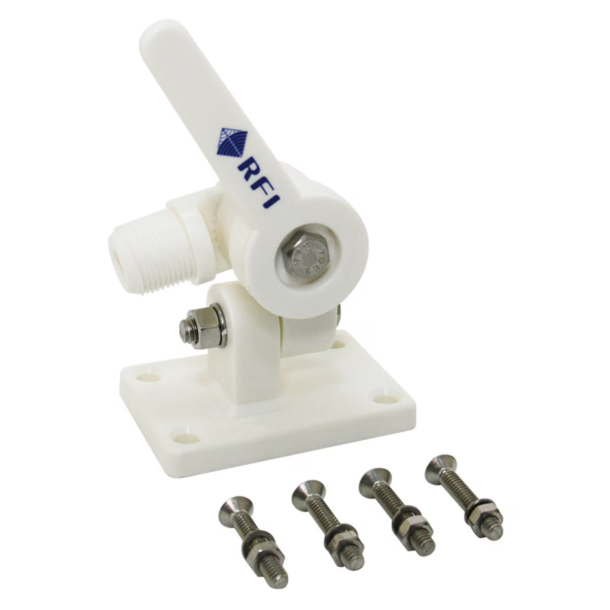 RFI MAM-101 White Marine Knock Down Antenna Mount with Hardware - Professional Lay-Down Marine Antenna Mount with 1" 14TPI Thread, Stainless Steel Hardware, and Adaptor Compatibility for RFI CD and CDQ Series Antennas