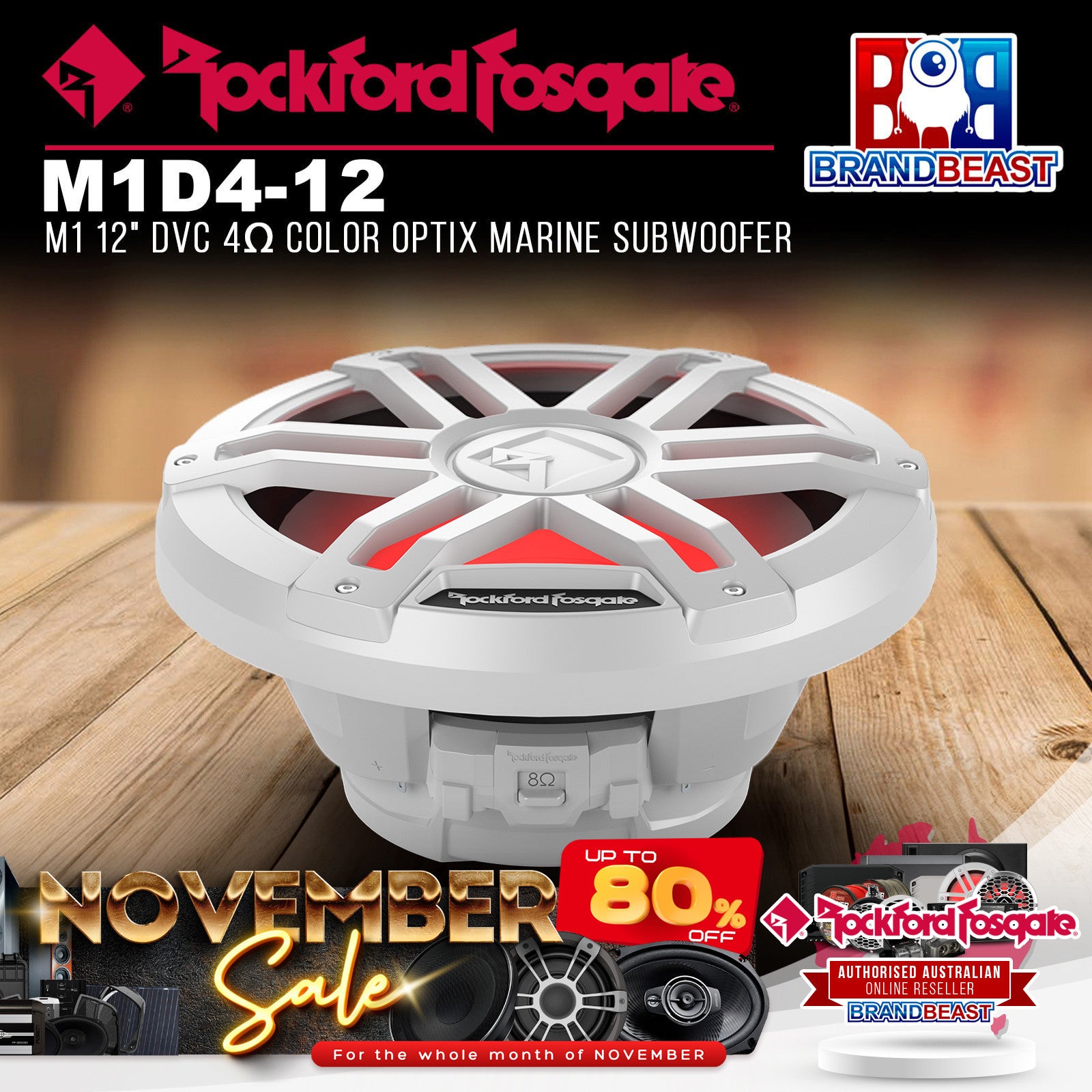 The M1D4-12 Color Optix™ 12‚Äù DVC 4-Ohm subwoofers deliver loud, clear, accurate bass, and light the way for your journey! The subwoofers connect with the Rockford Fosgate Color Optix™ Controller and RF Connect App, allowing you to customize your own color patterns. The Element Ready™ design and IP67 certification make them truly purpose-built for marine or motorsport applications where protection from damaging UV rays and water spray is essential. The M1 series of Element Ready™ subwoofers are designed to pair with the Rockford Fosgate Color Optix™ Controller and RF Connect App through its Deutsch™ and Amphenol™ connectors integrated into the basket. This combined with their IP67 certification makes these speakers Element Ready™ and truly purpose-built for marine applications. To complement the plug-and-play connectivity and streamline installation, M1 subwoofers are equipped with a VersaSwitch™ to make changing impedance between 1 and 4 ohms as easy as flipping a switch. Color Optix™ Experience Experience the Color Optix™ speaker and subwoofer line from Rockford Fosgate. Designed for watercraft of all kinds, they are Element Ready to withstand water, salt, and UV rays.