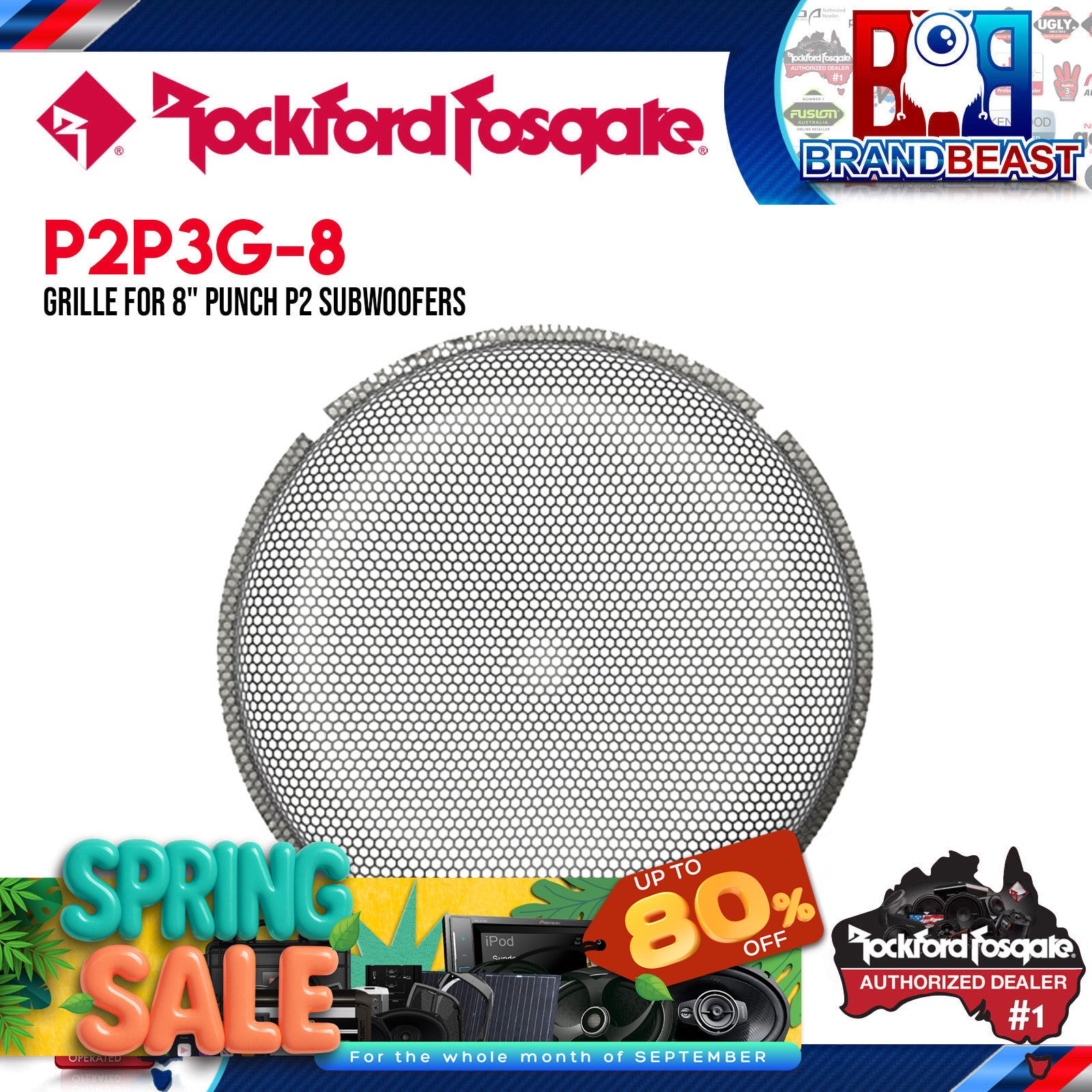 Stamped steel grille insert for select Rockford Fosgate 8" Punch P2 and P3 subwoofers. Requires trim ring originally included with subwoofer to hold grille in place. Made from stamped metal, this black grille will protect your 8" P2 & P3 subwoofers from the brutal environment of your trunk. Keeps your golf clubs, softball bats, hockey sticks or even baby strollers away from your prized Rockford Fosgate subwoofers. Simply remove the existing trim ring from your woofer, insert the mesh grille, and re-secure the trim ring. Compatible with select models. Rockford Fosgate P2P3G-8 Features: