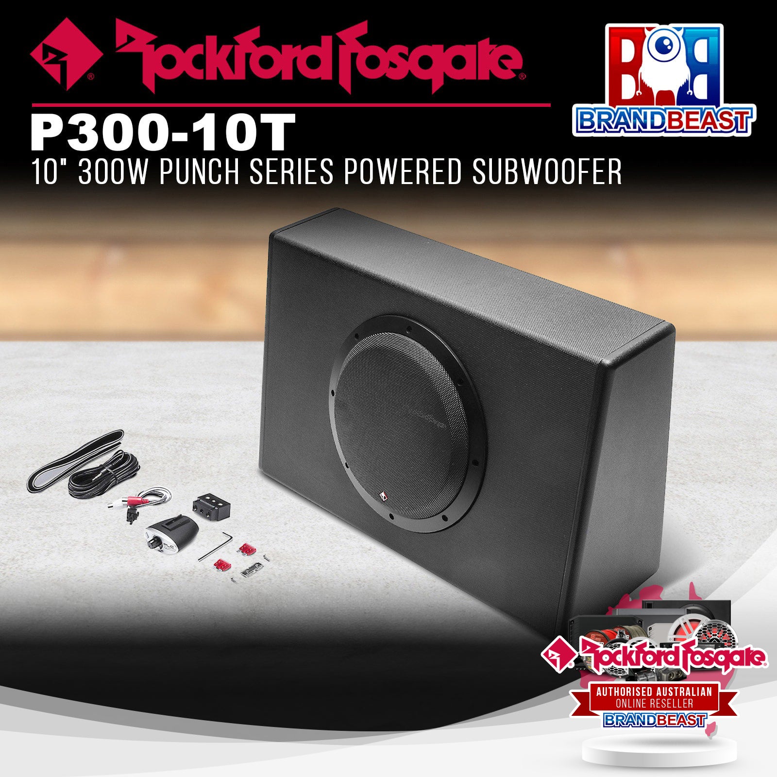 The Punch P300-10T is a universal "all in one" solution for dropping Bass in any factory or aftermarket system. This model features a 10" high output woofer with a 300-watt internal amplifier in a slim design enclosure that's great for universal truck applications. The enclosure features quick-release input and power connectors for easy removal when extra space is required. The Punch 300-10T is a self-contained subwoofer enclosure with a built-in amplifier. This "all in one" solution is great for systems that need extra Punch on the low end of the frequency spectrum. The 10" high output subwoofer is impedance optimized for the built-in 300-watt class-D amplifier that features a low-pass crossover, bass EQ, and phase switch. The enclosure can be connected via speaker-level inputs for connection to factory systems, or traditional line-level inputs for aftermarket systems. It also features an intelligent auto turn-on/off circuit that eliminates the need for a separate turn-on wire. The enclosure itself is precision designed and constructed using MDF (Medium Density Fiberboard) for the best acoustical properties and covered with a heat-activated vinyl finish to resist marks. Features: