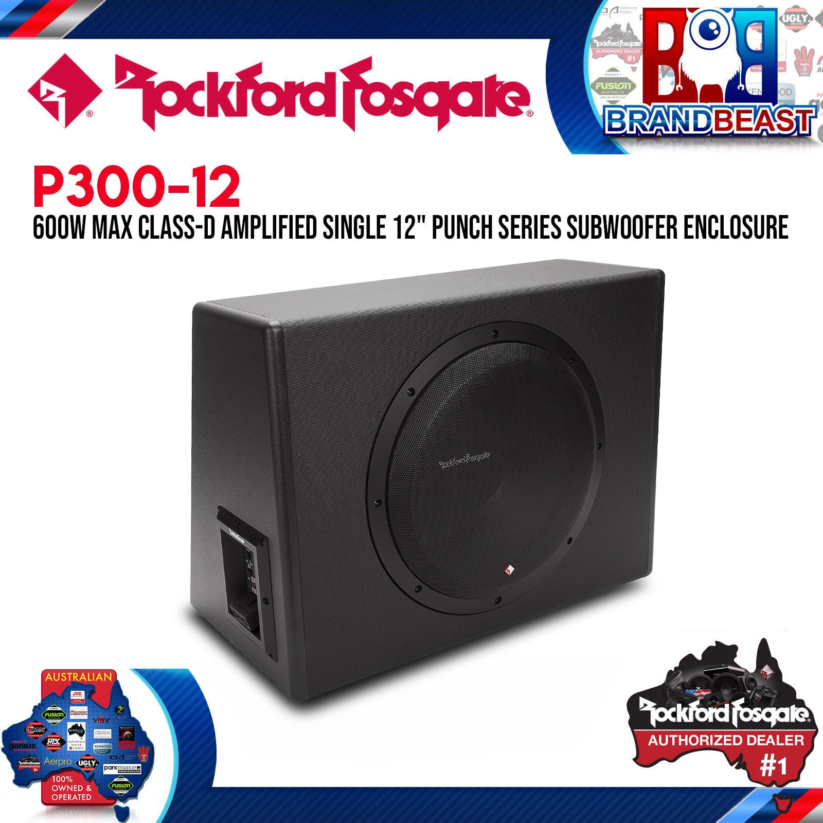 The P300-12 powered subwoofer is an “all-in-one” solution when adding bass to a factory system or just to save space. This model features a 12” subwoofer in a sealed enclosure powered by an internal 300 watt amplifier. If you need to quickly add bass to a system or want to alleviate the hassle of separate amplifiers and subwoofers, then the P300-12 is the right one for the job! The P300-12 features a Punch 12” subwoofer in a custom sealed enclosure and is powered by a mighty 300 Watt amplifier. The system is all-inclusive, so you only need to run power, ground and a signal from the source to get this baby moving. Features a durable exterior that resists scrapes and bumps while in the trunk or cargo area.