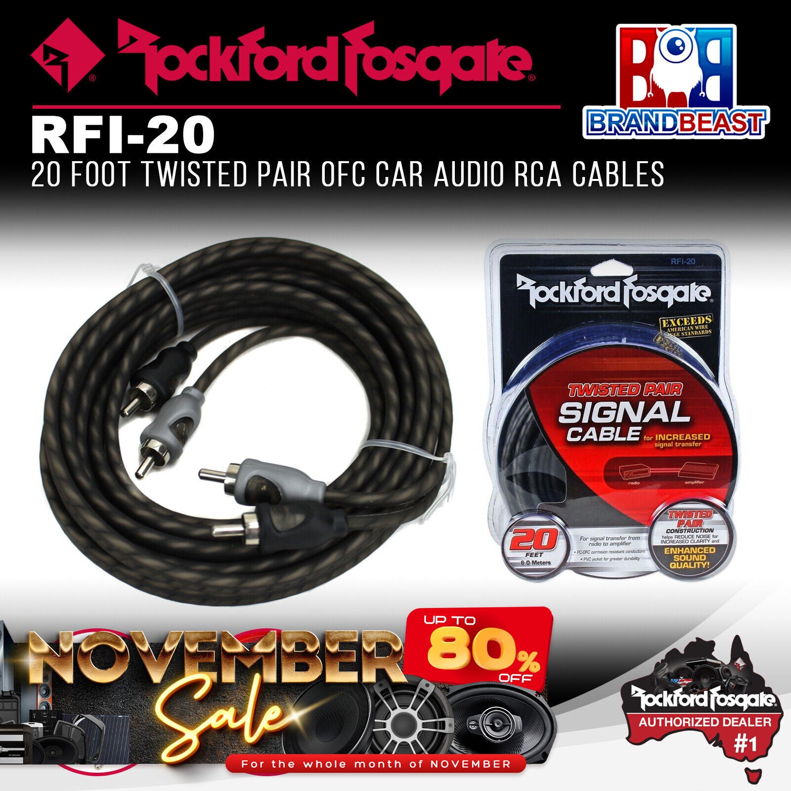 20 feet (6 meters) twisted pair RCA cable with woven outer shield. Twisted pair design for noise rejection, split center pin for a secure connection, frosted outer shield for durability and flexibility.