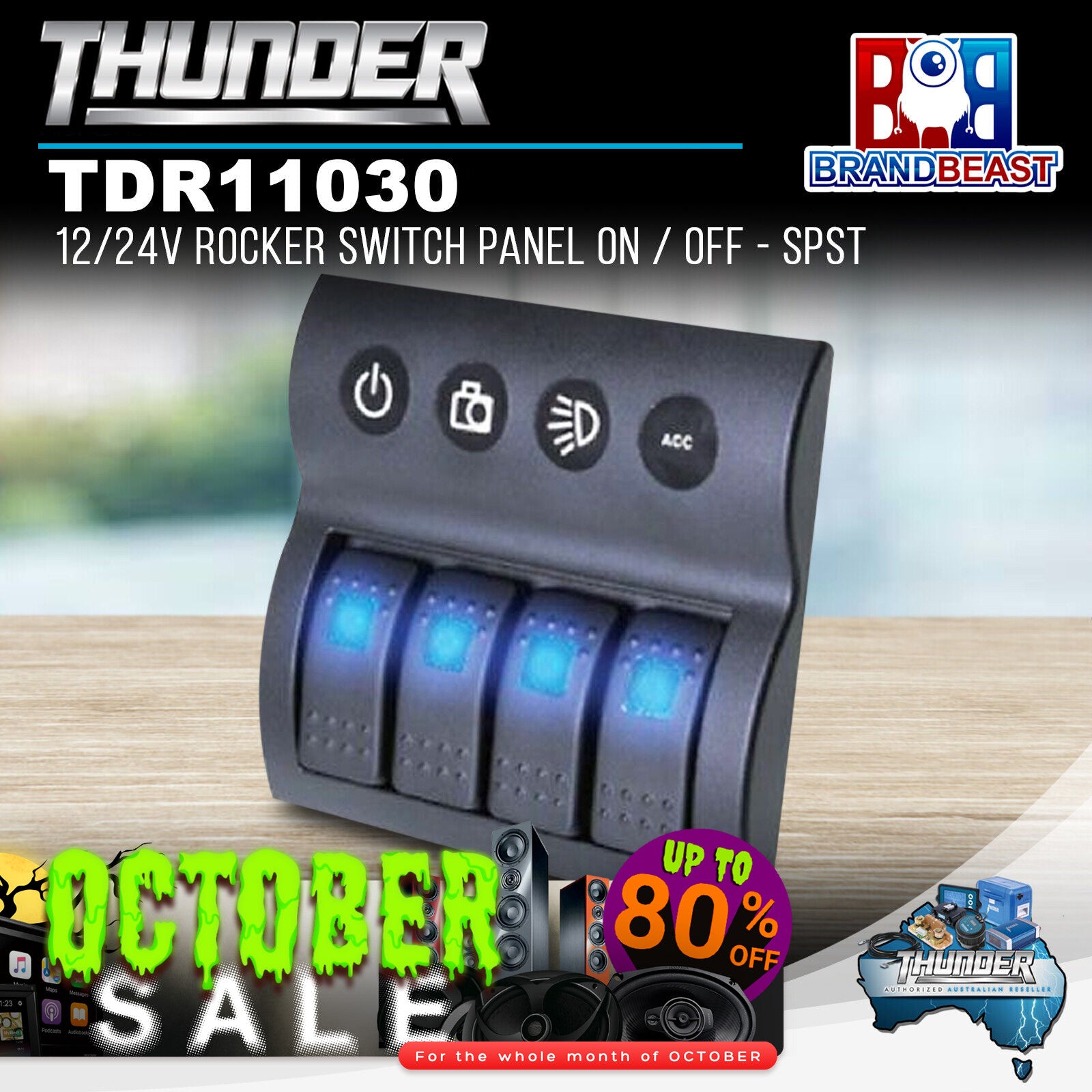 Illuminated Rocker Switch Panel Thunder's range of illuminated switches will ensure you turn on the right equipment when needed. Each with a 20A, 12/24V draw, all rocker switches offer twin action and blue backlit icons for easy identification. Pre-wired with common negative and positive inputs. Features: